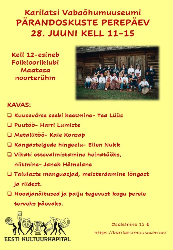 Karilatsis on pärandoskuste päeval tegemist nii suurtele kui väikestele. Õpime seebikeetmist (meister Tea Lüüs), puutööd (meister Harri Lumiste), metallitööd (Kaie Konsap) ja kangastelgede kasutamist (Ellen Nukk). Veel saab proovida vikatiga niitmist, vikati teritamist, aia- ja põllutöid. Lapsed saavad teada, millega vana aja lapsed mängisid, ning soovijad võivad omale isegi mänguasja meisterdada. Pärandoskuste õpetajad näitavad meeleldi töövõtteid ning lubavad ka külastajatel käed külge lüüa ja näpuosavust proovida. Kindlasti saab neilt ka näpunäiteid edasiseks harjutamiseks.